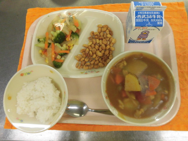 牛乳・チキンカレー・大豆のカリカリ揚げ・ブロッコリーとコーンのサラダ