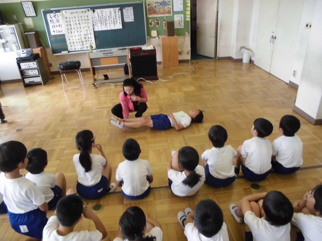 2人組になり、交代で腹筋を鍛えます。 「ロングトーン」小さな声を出し続けます。