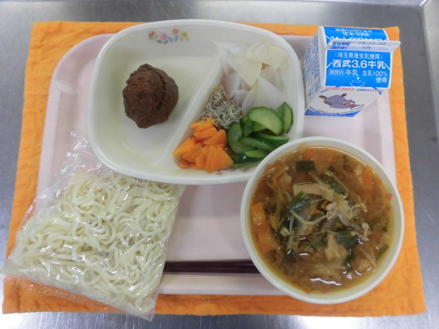 絵文字:食事 給食牛乳・キムチ入りゴマ味噌ラーメン・大根とジャコのサラダ・おからドーナツ絵文字:食事 給食