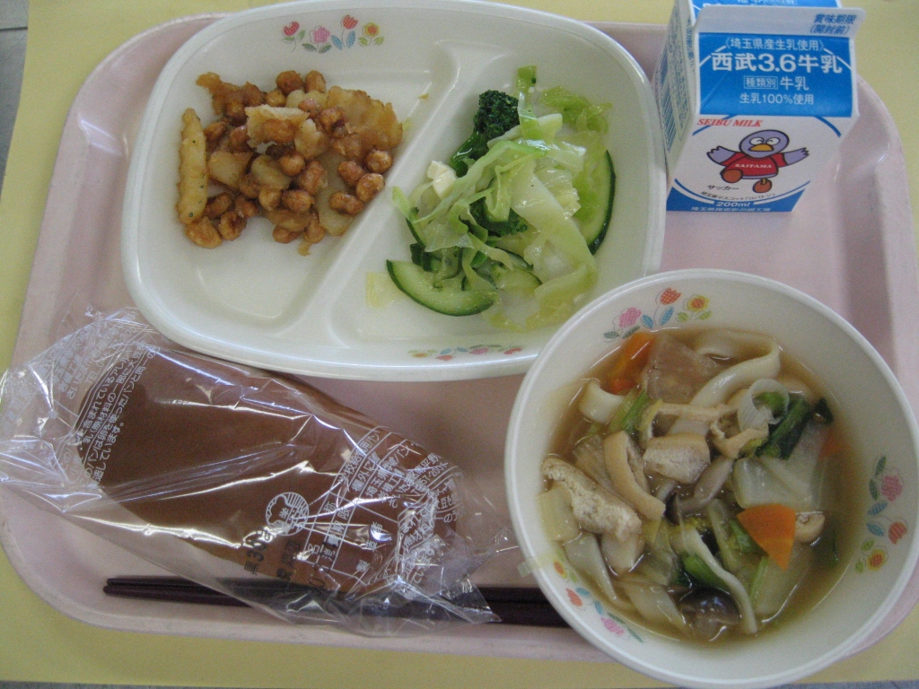 牛乳・黒パン・煮ぼうとう・大豆とポテトの揚げ煮・グリーンサラダ
