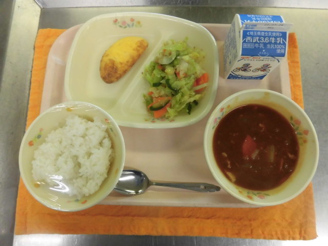 絵文字:食事 給食牛乳・ハヤシライス・オムレツ・セサミサラダ絵文字:食事 給食