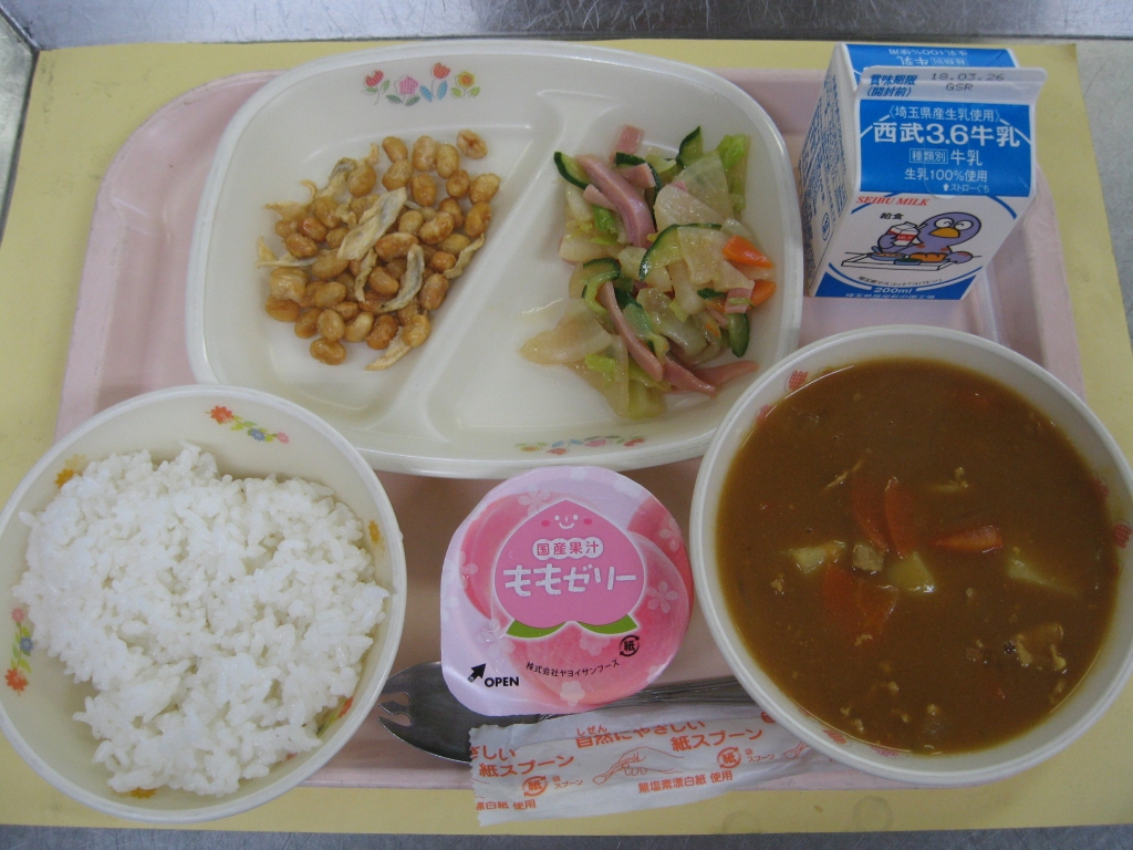 牛乳・カレーライス・大豆とゴボウのカリカリ揚げ・ハムと大根のサラダ・桃のゼリー