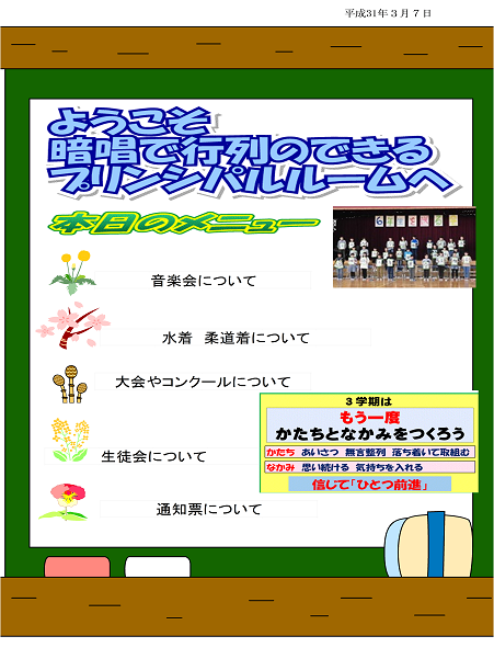 1日(金)から始まった6年生との会食も本日で5回目となりました。合計で8回予定しています。4人班で子供たちが校長室にやってきてくれます。会食の話題は中学校に向けての内容、学習、生活、部活動、きまり・・をメニューとして6年生が選びやりとりするかたちで進んでいます。どの子どもたちもとても礼儀正しく、中学校でのイメージしている児童の様子が伝わりました。どの班も時間も足りないくらいでした。
