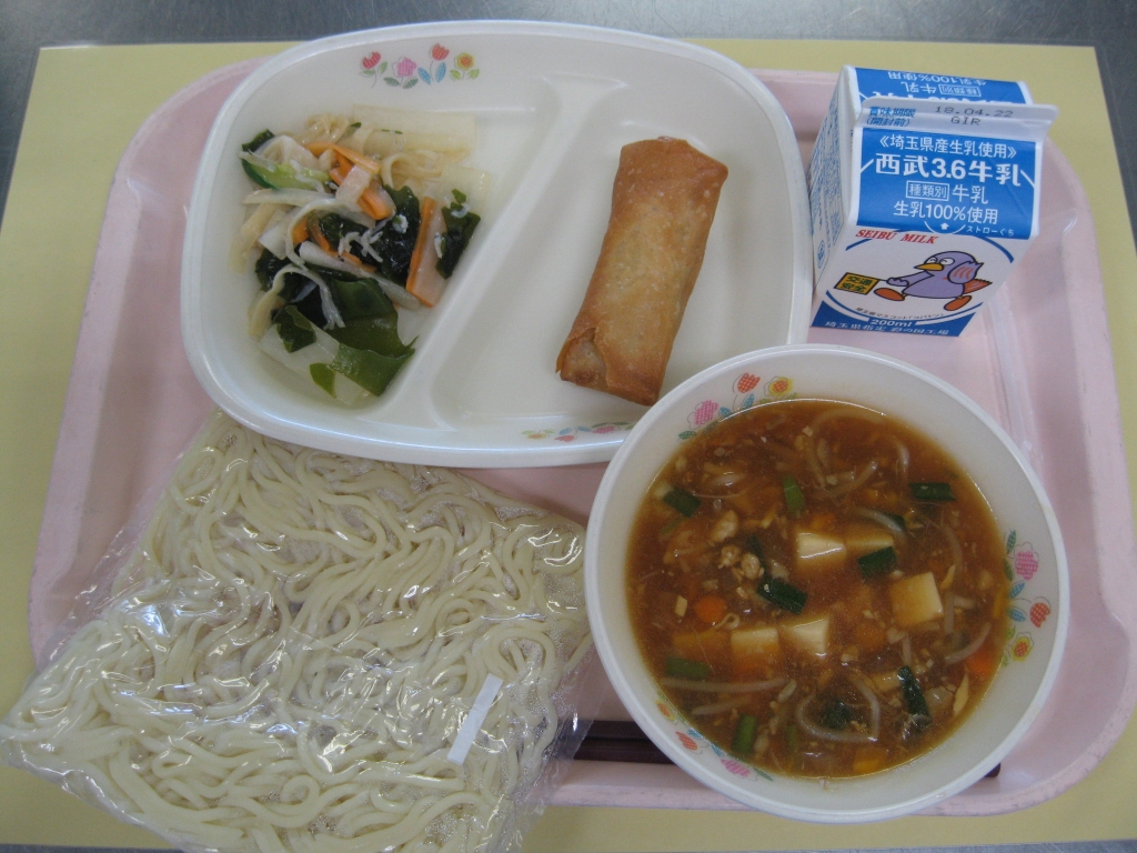 牛乳・麻婆ラーメン・春巻き 大根とジャコのサラダ