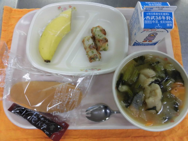 絵文字:食事 給食牛乳・コッペパン・チョコクリーム・竹輪の磯辺揚げ・すいとん・バナナ絵文字:食事 給食