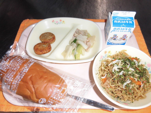 絵文字:食事 給食牛乳・黒パン・白ごまつくね・ハムと大根のサラダ・ソース焼きそば絵文字:食事 給食