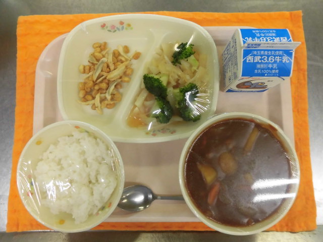 牛乳・ハヤシライス・大豆とゴボウのカリカリ揚げ・ブロッコリーと大根のサラダ