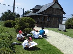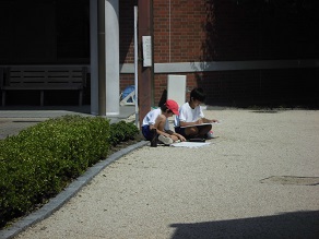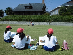 5年生が写生会に行ってきました。5年生の題材は、大寄公民館に移築されている渋澤栄一翁のゆかりの建物「誠之堂」「清風亭」を描きます。この建物は、斜めから全体を捉えて描けるとよい絵になりそうです。子どもたちは、自分の描きたい場所に陣取って描いていました。
