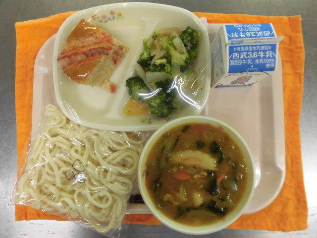 牛乳・カレーうどん・イチゴパンケーキ・ブロッコリーと大根のサラダ