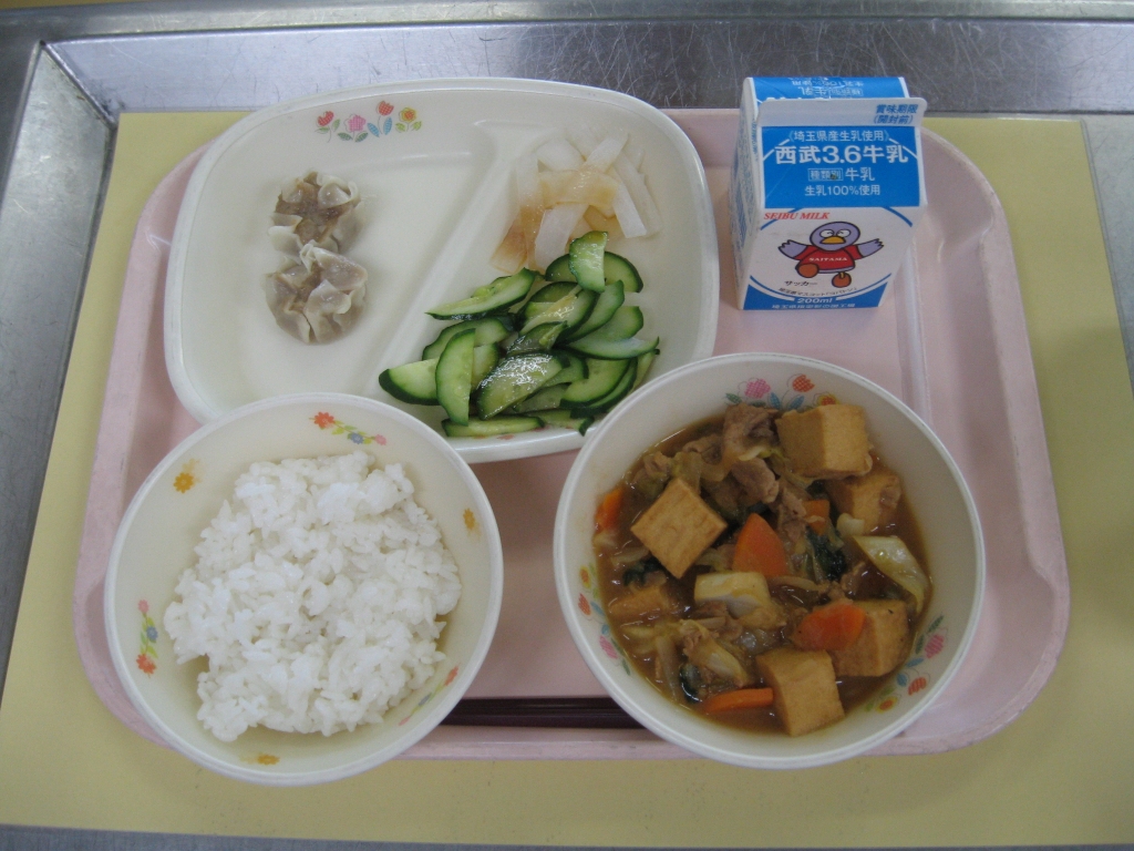 牛乳・ごはん・厚揚げのチャオサイ・スティック野菜・しゅうまい