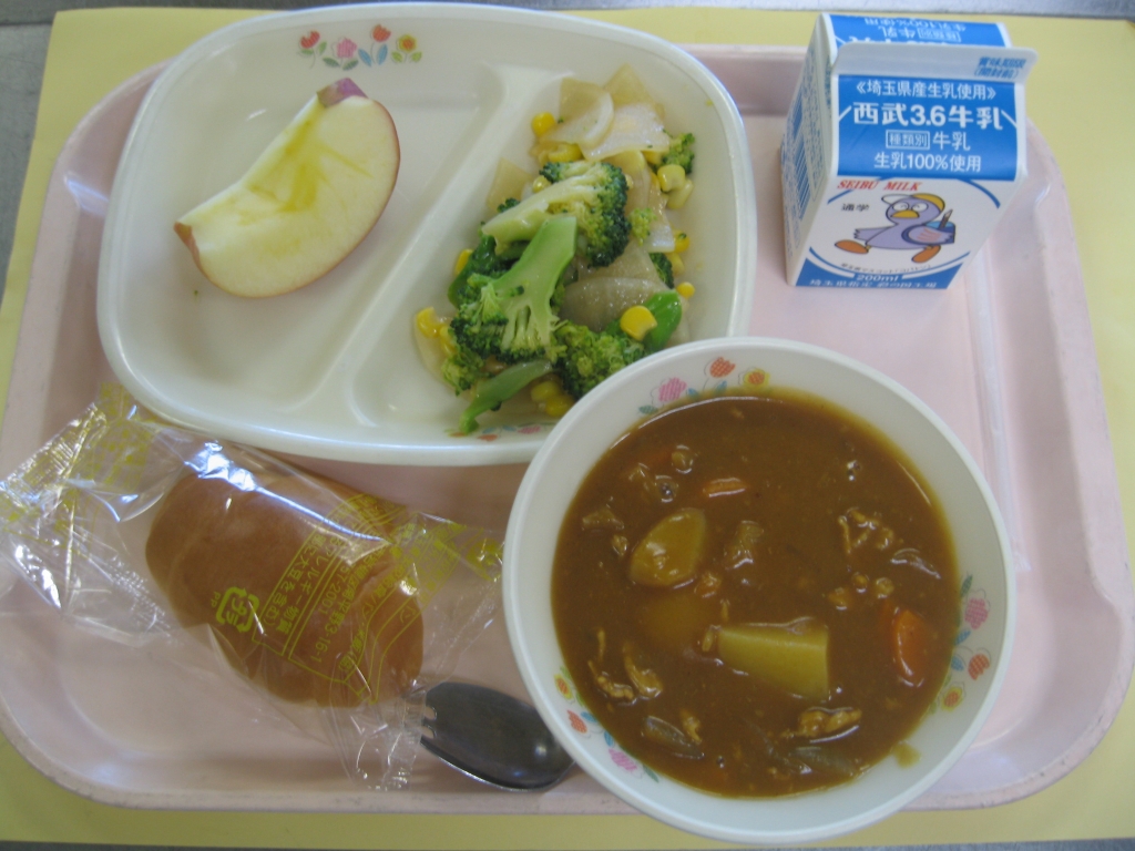 牛乳・バターロール・カレー・ブロッコリーサラダ・りんご