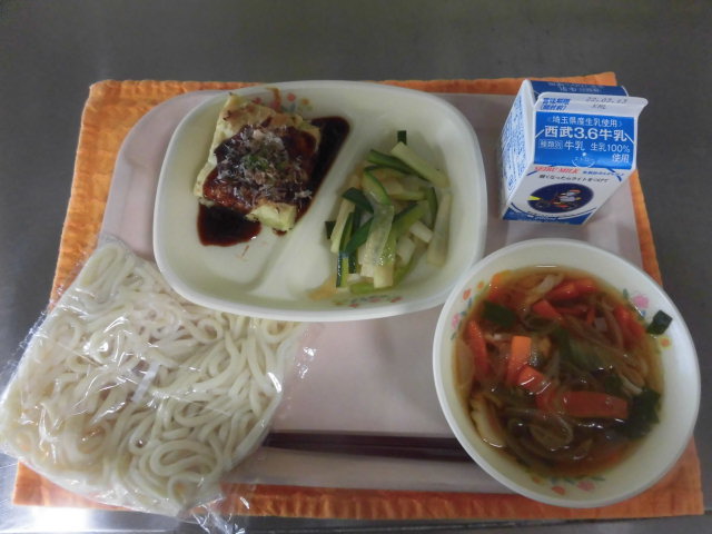 絵文字:食事 給食牛乳・肉うどん・お好み焼き・スティック野菜絵文字:食事 給食