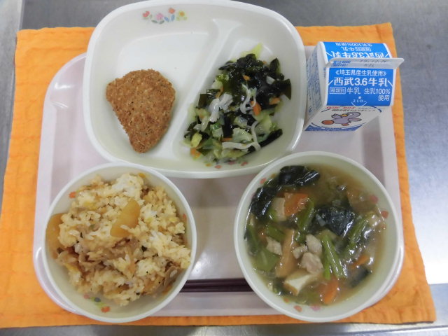 絵文字:食事 給食牛乳・キムタクご飯・カボチャのひき肉フライ・和風サラダ・まるごと玄米のポカポカ汁絵文字:食事 給食