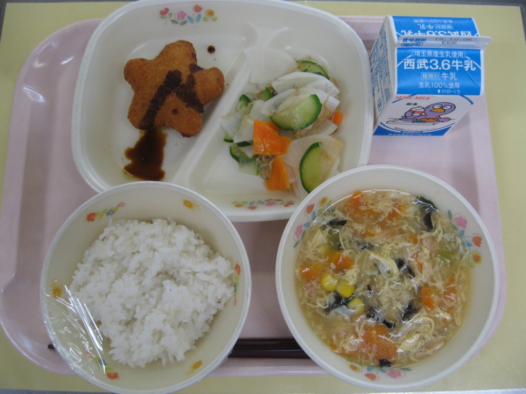 牛乳・ごはん・星のコロッケ・大根とジャコのサラダ・コーン入り華風スープ
