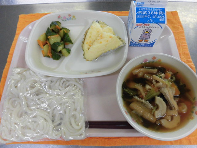 牛乳・五目うどん・オレンジパンケーキ・ペッパーきゅうり