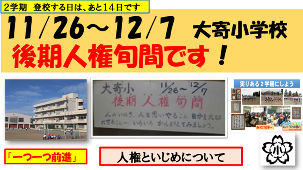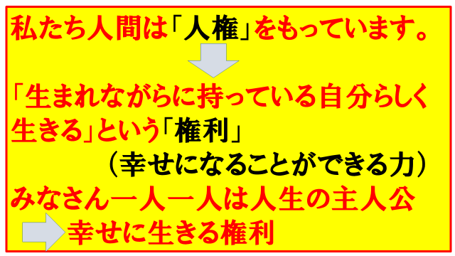 後期の人権旬間にあたり本日、人権朝会が開催されました。人権作文の表彰、人権作文の発表(3年髙橋 莉子さん)そして校長講話の中身でした。前期の集会でも「人権」について考えていただきました。自分もみんなも「幸せ」になる権利をもっており、いじめはこれを犯してしまう行為であり許せない行為。いじめを解決することはとても大事なこと。いじめはだれ一人「幸せ」にしないため。「人の苦しみが見えますか 見ようとすること 感じようとすること」そして終わりに6年生の作文の一部を紹介して終わりました。