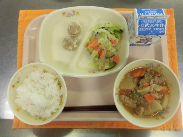 絵文字:食事 給食牛乳・ごはん・豚肉と大根の煮込み・しゅうまい・上州サラダ絵文字:食事 給食