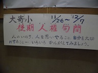 2学期もあと1か月をきりました。11月26日(月)~12月7日(金)は後期の人権旬間になります。人権についての理解を深め、自分を大切にすると共に、相手を認め、大切にしようとする気持ちを育てる。また、いじめや差別を許さない心を持ってより望ましい集団づくりに向けて努力する児童を育てることをねらいに、子どもたちに日頃の生活をふりかえり人権について深く考える機会としていきたいと思います。今後の取組として、12月4日(火)人権朝会、18日(火)には本校の卒業生で現在早稲田大学教授の中林美恵子先生からの人権講話も予定しています。