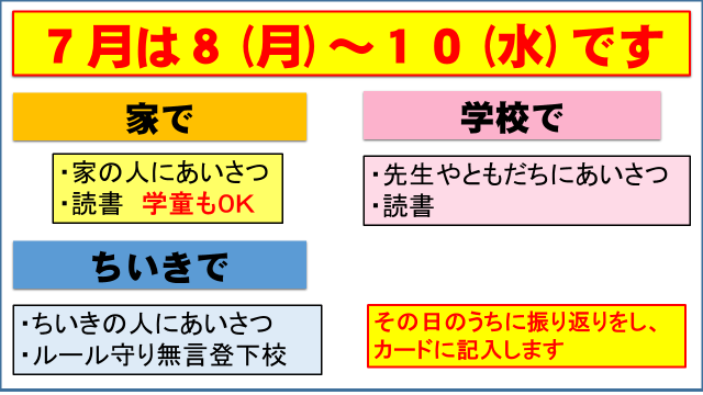 昨日8日(月)、臨時の全校朝会を実施しました。内容は金曜日所沢で起きた中学生同士の痛ましい事件に触れました。中学生の件ではありますが、ものを勝手に触られたり、隠されたりするなど同じことはこの学校でも起こっています。カットして大きなことにつながっていないだけのことです。そして大事なのはイヤなことをされたらすぐに相談することが大切。一人で考えることなく学校で会ったことはすぐに学校の先生や友だち相談。間違っても仕返しなど考えないこと。月曜から始まる6つの誓いの日・ハートの日の取組をしっかりして欲しいことを話しました。