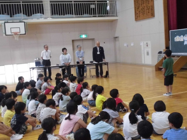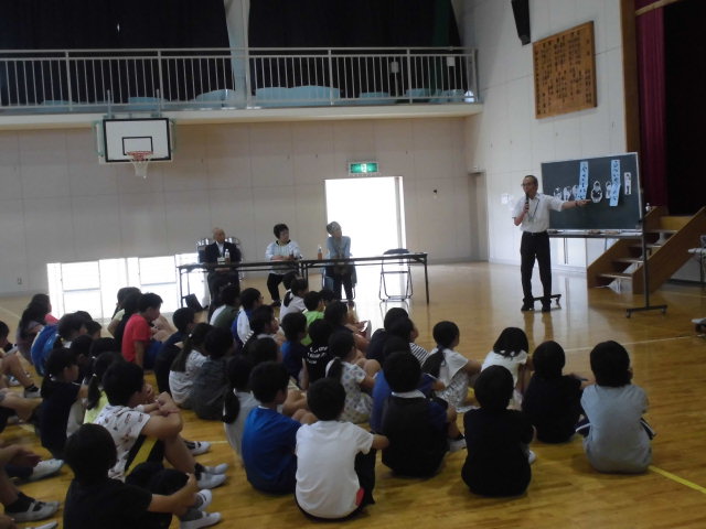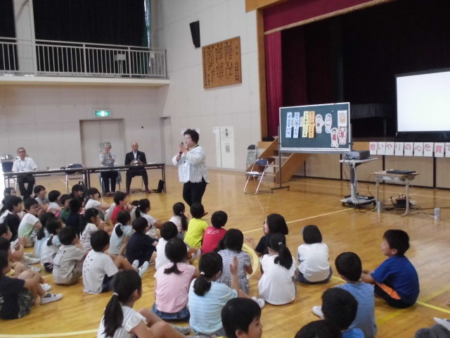 時、2校時(1~3年生)、3校時(4~6年生)に人権教室がありました。指導者は、人権擁護委員の皆様です。2校時は紙芝居「じゅんちゃんのハッピーバースデイ}を見た後、講話をしていただきました。3校時はDVD「勇気のお守り」視聴後、SOSミニレターの紹介、『ひとつのことば』(北原白秋)の詩を紹介していただきました。