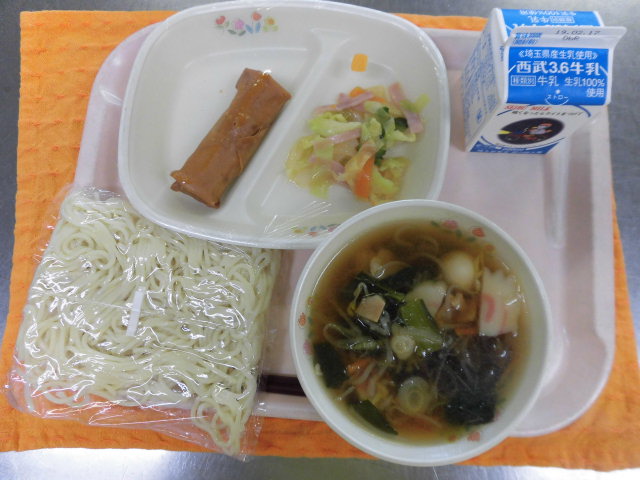 牛乳・醤油ラーメン・春巻き・ハムと大根のサラダ