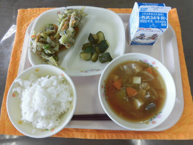 絵文字:食事 給食牛乳・かきあげ丼・ピリッときゅうり・豚汁絵文字:食事 給食