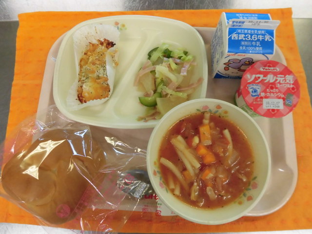牛乳・フラワーロールパン・チキンの香味焼き・ハムと大根のサラダ・ミネストローネ