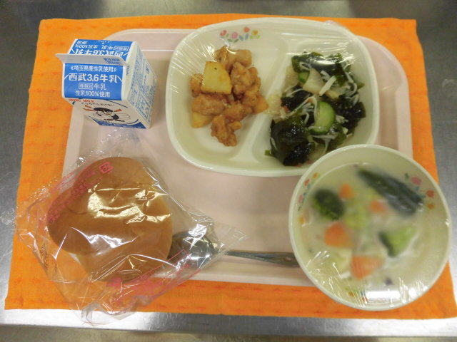 牛乳・フラワーロールパン・鶏肉とじゃが芋のオレンジ煮・大根とジャコのサラダ・冬野菜の豆乳スープ