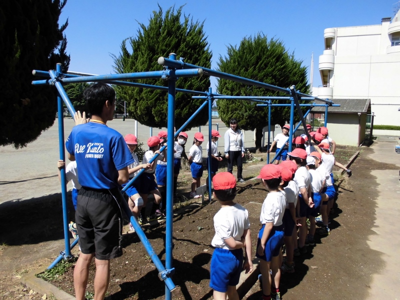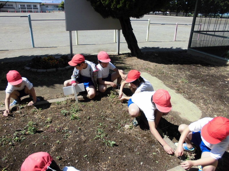 3年生は、理科でこれから育て、観察をしていくホウセンカを植える準備でした。でも、花壇には昨年の種がこぼれていて、ホウセンカの幼葉や双葉がでていました。