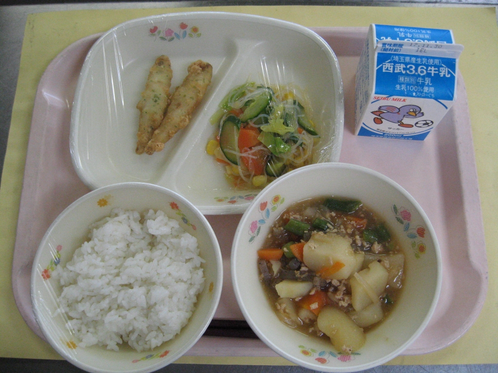 牛乳・ごはん・ワカサギフリッター・中華サラダ・ジャガイモのそぼろ煮