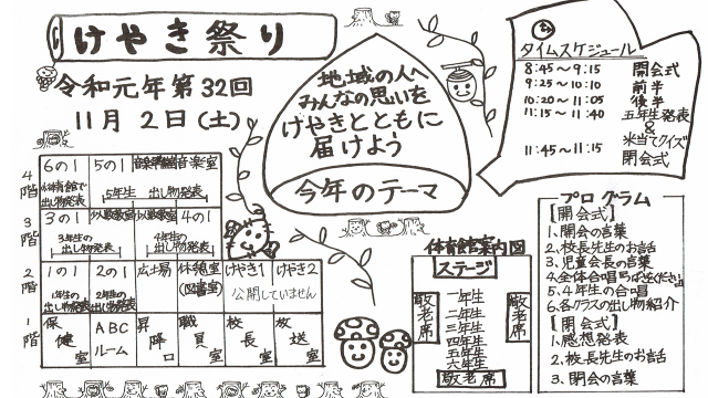 明日11/2土は、けやき祭りです。たくさんの保護者・地域のみなさんのご来校を心よりお待ちしています。プログラムを載せますのでご参照ください。