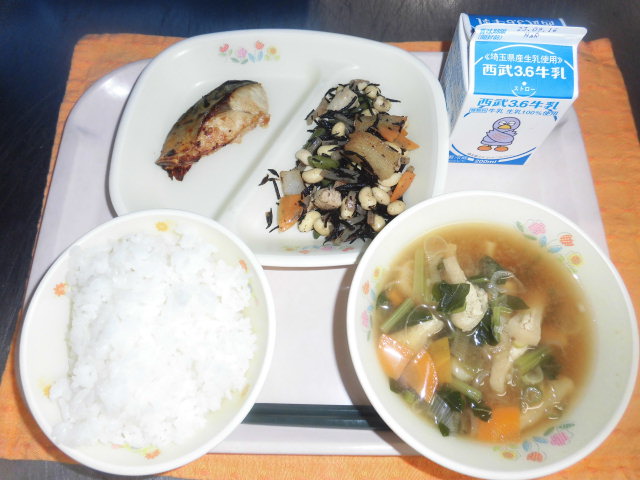 絵文字:食事 給食牛乳・ごはん・サバのしょうが焼き・大豆の磯煮・じゃがいものみそ汁絵文字:食事 給食
