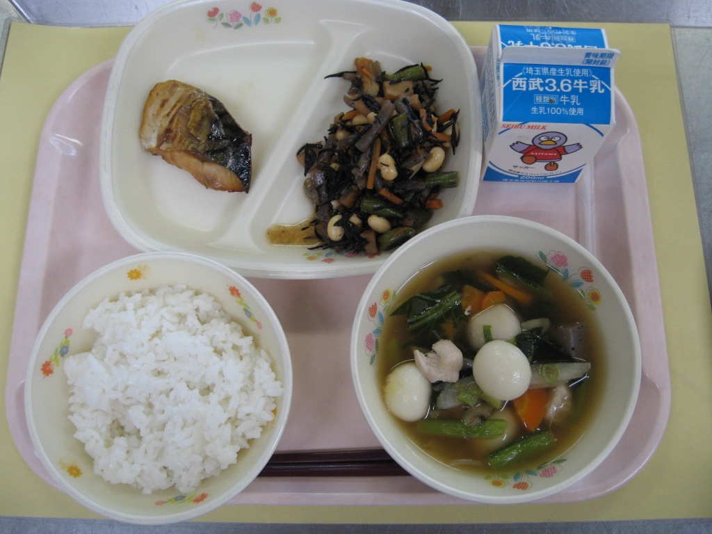 牛乳・ごはん・サバの塩焼き・大豆の磯煮・お月見汁