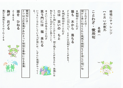 6月の暗唱にチャレンジは「ことわざ 慣用句」です。その内容を紹介します。すでに全校児童にも配布してあります。ご家庭でも是非取り組みをしていただき学力向上の一助としていきたいものです。よろしくお願いします。「ことわざ 慣用句」クリック→6月の暗唱.pdf