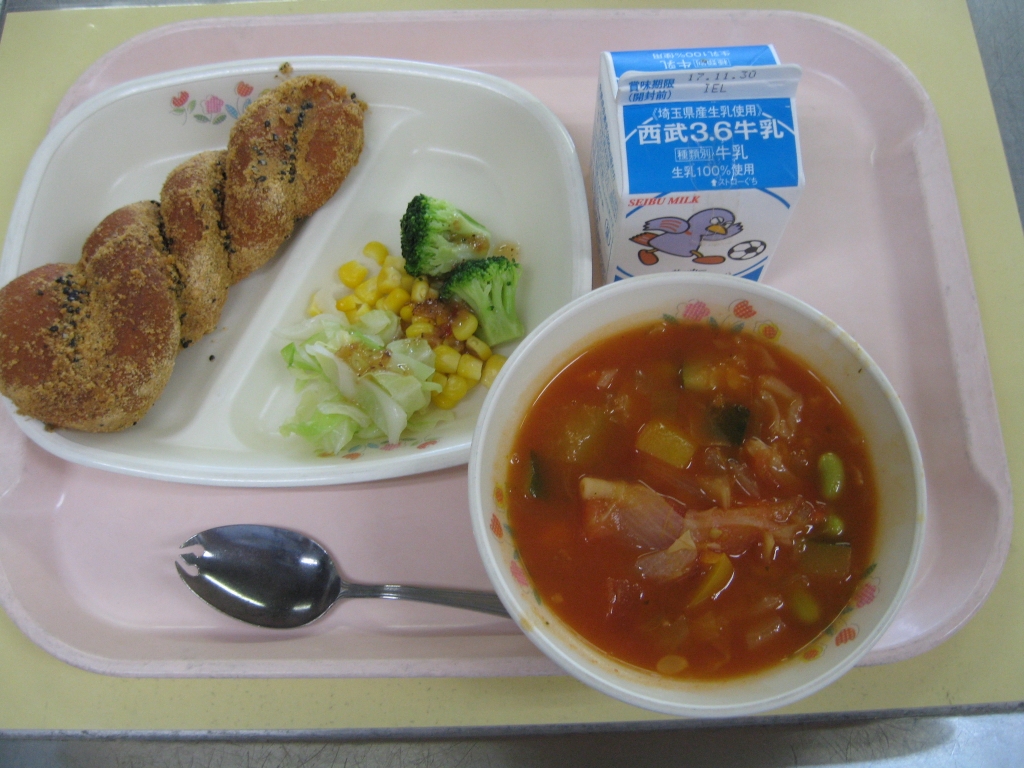 夏野菜が沢山入ったミネストローネです。夏野菜のトマト、ピーマン、ズッキーニ、カボチャ、枝豆、その他にもキャベツと人参、玉葱が入って色とりどりでキレイです。旬の野菜は栄養価も高く、深谷産のカボチャとズッキーニ、トマトを使用しています。子供たちが大好きな黒ごまきなこ揚げパンは、冷めても美味しい甘さ控えめの揚げパンに仕上がりました。