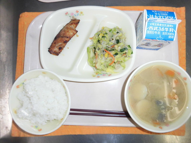 絵文字:食事 給食牛乳・ごはん・ブリの照り焼き・野菜炒め・重忠汁絵文字:食事 給食