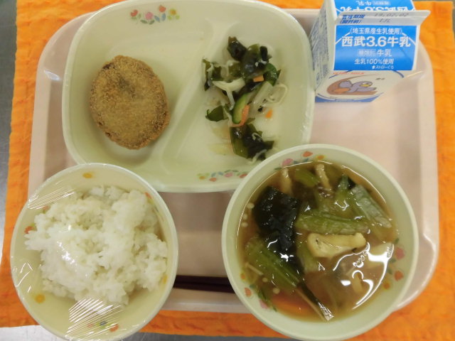 牛乳・ごはん・レバー入りメンチカツ・大根とジャコのサラダ・里芋の味噌汁