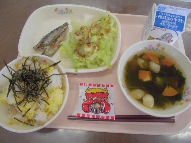 牛乳・ちらし寿司・小イワシの唐揚げ・ゆでキャベツ・