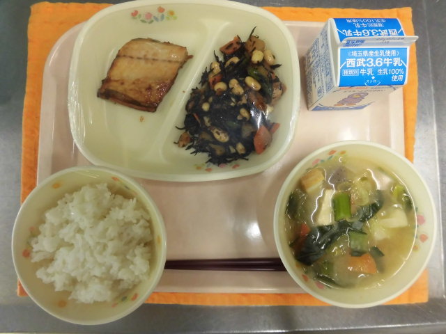 絵文字:食事 給食牛乳・ごはん・サバの生姜焼き・大豆の磯煮・野菜椀絵文字:食事 給食