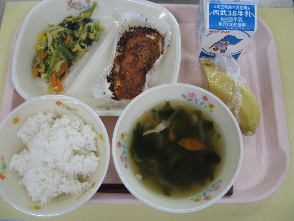 牛乳・ごはん・韓国風鶏の照り焼き・野菜とじゃこの炒り煮・中華スープ・バナナ