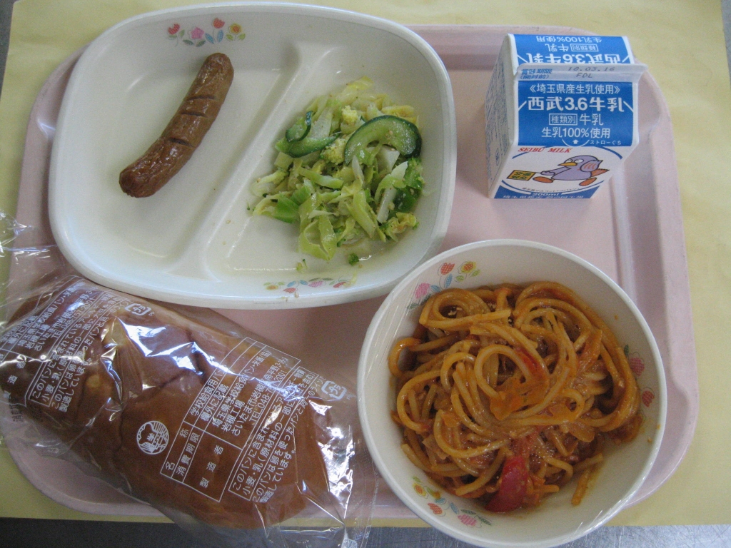 牛乳・パインパン・トマトクリームジェノバ風パスタ・焼きウインナー・セサミサラダ