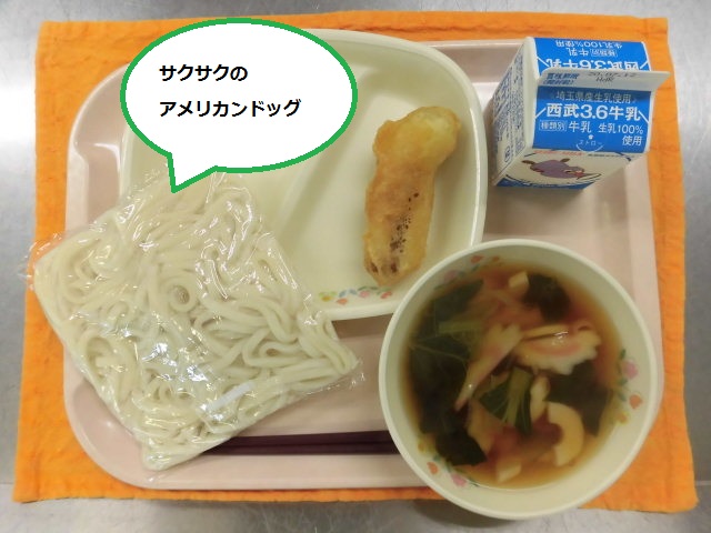 絵文字:食事 給食牛乳・五目うどん・アメリカンドッグ絵文字:食事 給食