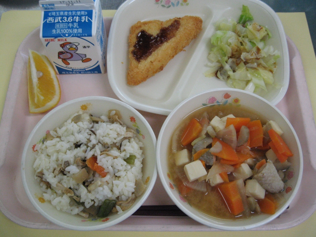牛乳・かてめし・チーズハンペンフライ・茹でキャベツ・吟子汁・オレンジ