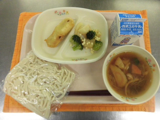絵文字:食事 給食牛乳・深谷ねぎたっぷりうどん・アメリカンドッグ・ポテトのさっぱりサラダ絵文字:食事 給食