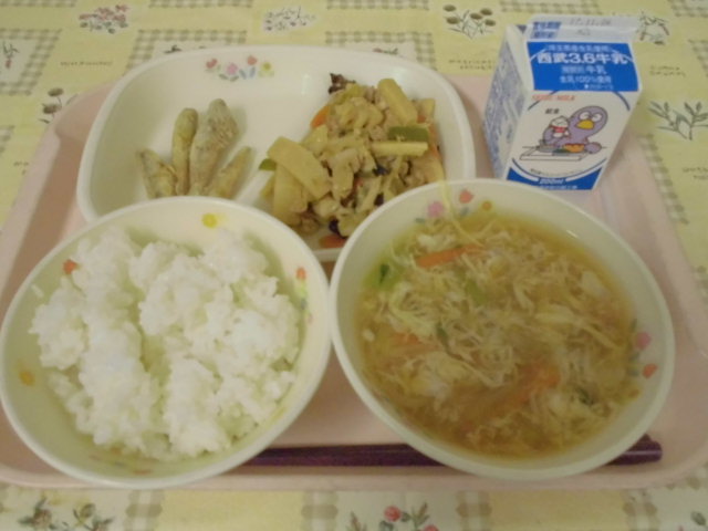 牛乳・ごはん・小イワシの天ぷら・回鍋肉・かきたま汁
