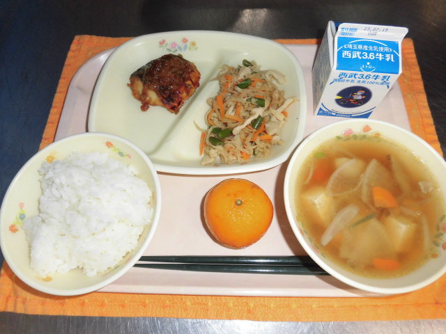 絵文字:食事 給食牛乳・ごはん・サバのネギみそ焼き・切り干し大根の炒り煮・けんちん汁・冷凍ミカン絵文字:食事 給食