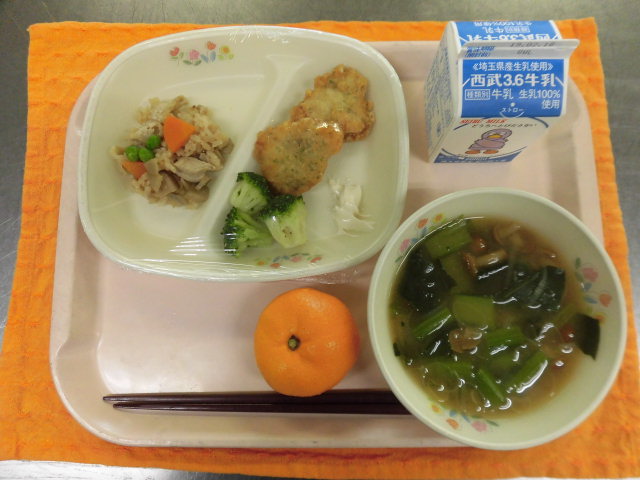 牛乳・鶏ゴボウ飯・アジフリッター・茹でブロッコリー・なめこ汁・みかん
