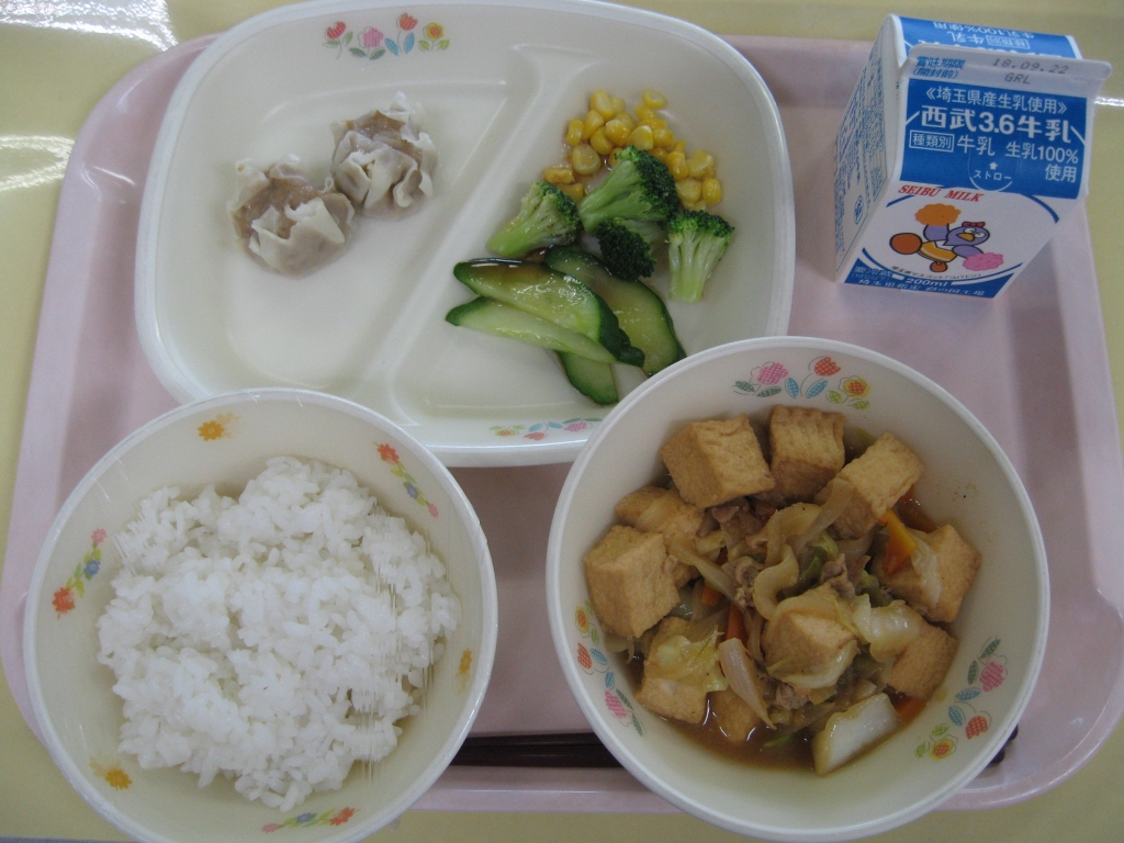牛乳・ごはん・厚揚げのチャオサイ・しゅうまい・サラダ
