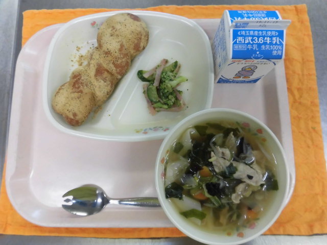 絵文字:食事 給食牛乳・黒ごまきな粉揚げパン・ブロッコリーサラダ・ワンタンスープ絵文字:食事 給食