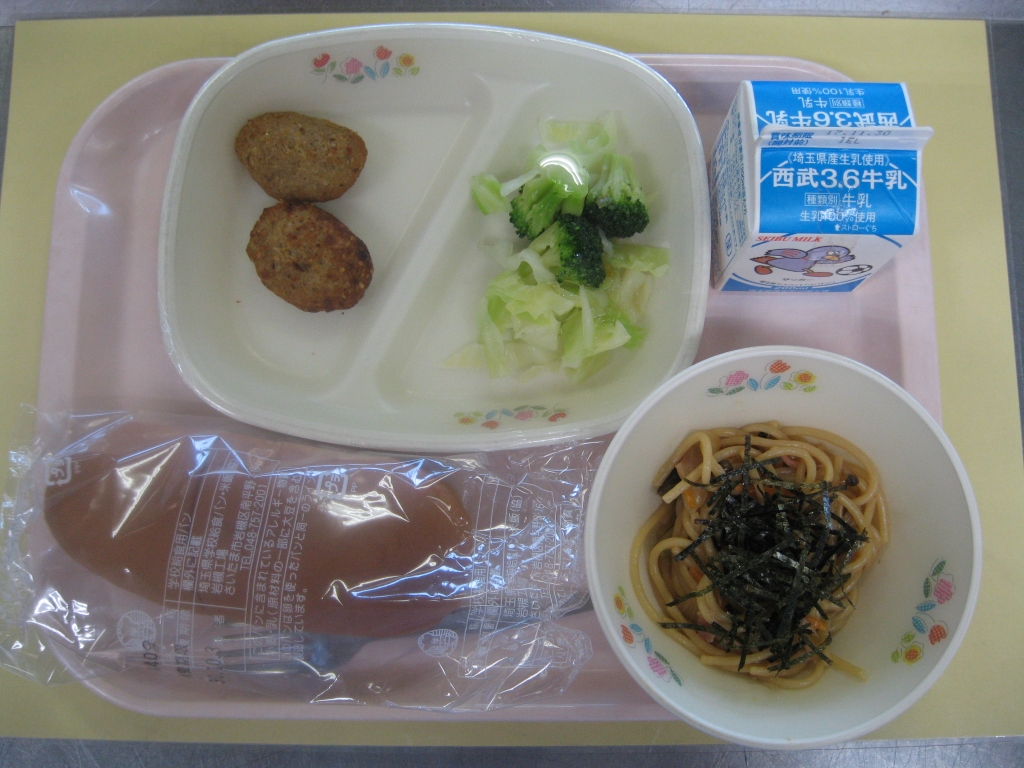 牛乳・黒パン・森のキノコスパゲティ・白ごまつくね・サラダ